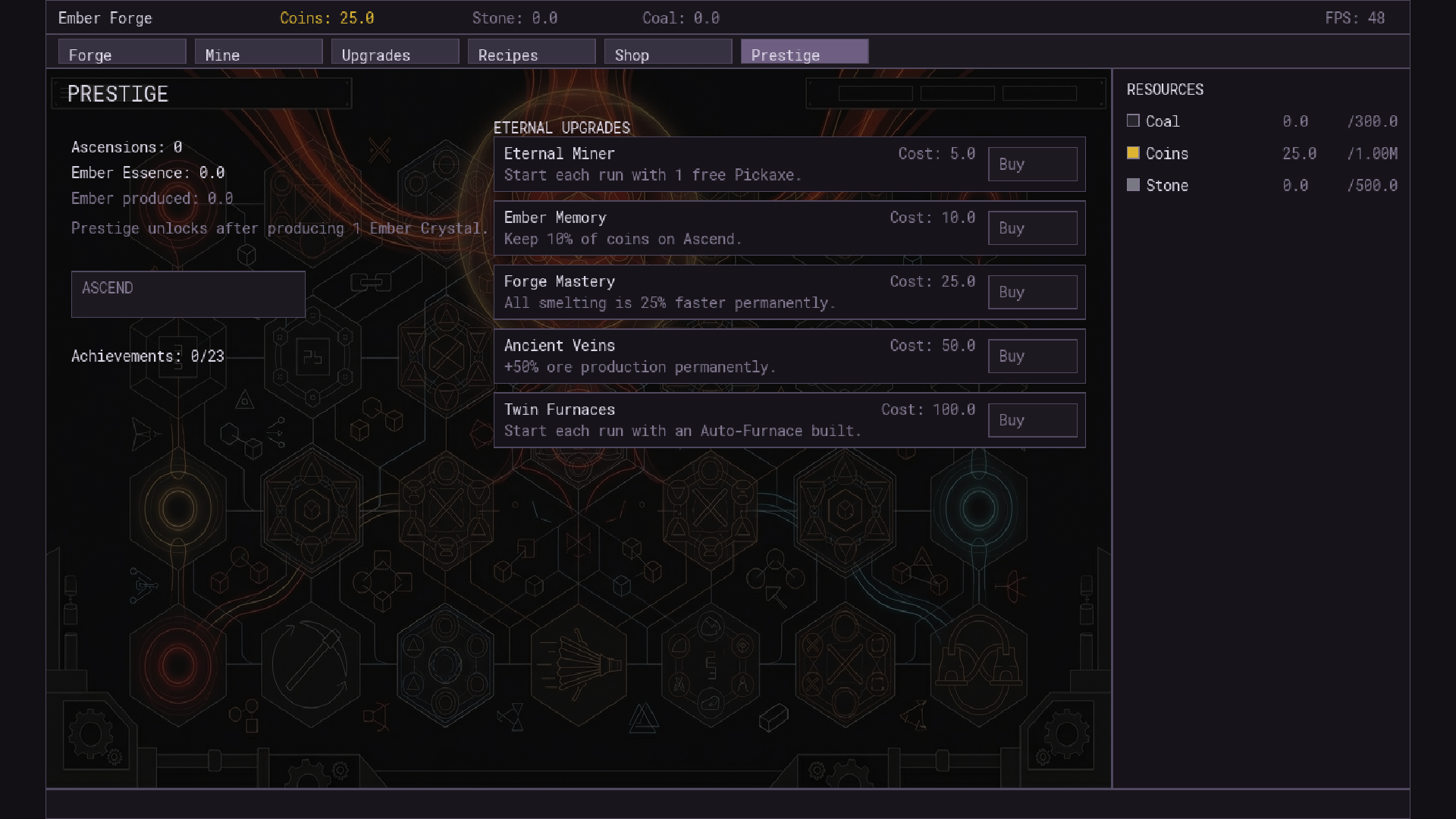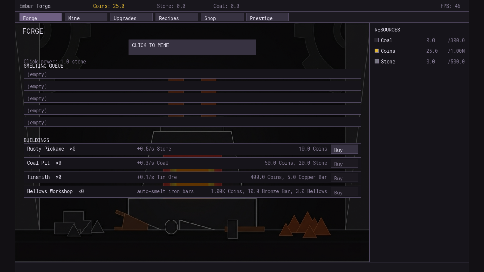 Start by clicking your way through stone and coal. Spend your first coins on a rusty pickaxe that mines while you're away. Queue iron bars in the forge. Use those bars to unlock bronze, then steel, then mythril. Buy buildings that automate what your hands used to do. Research upgrades that make everything faster and more efficient. Eventually condense raw mythril into an Ember Crystal, ascend, and do it all over again — permanently smarter, faster, and richer each time.